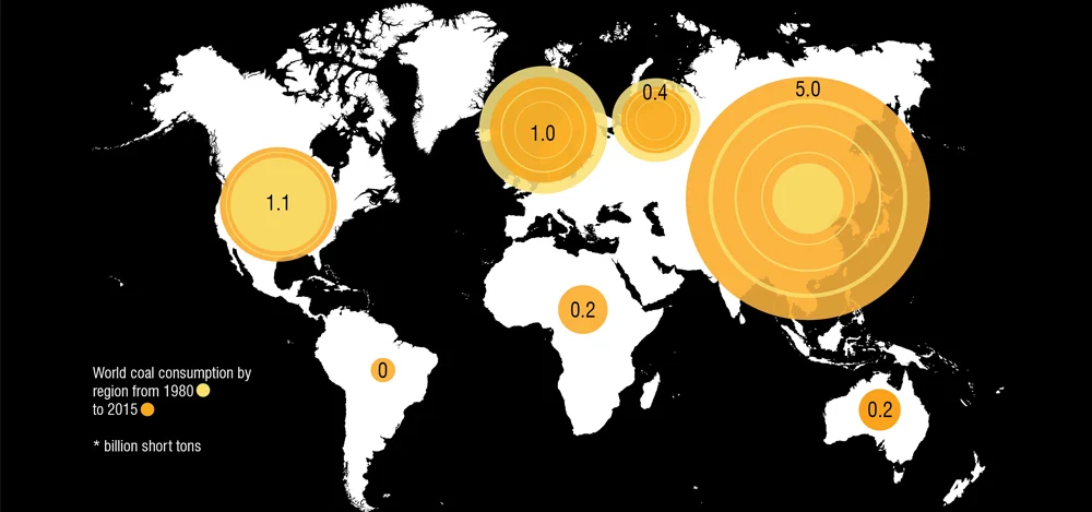 Pictured above: World coal consumption by region in *billion short tons from 1980 to 2015.